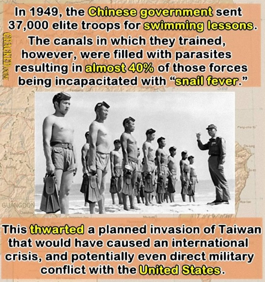 この画像を大きなサイズで見る1949年、当時の中国政府は3万7000人のエリート兵に水泳の訓練を実施。しかし運河で泳いでいた兵士の4割近くが寄生虫に感染し、住血吸虫症で体調を崩してしまった。