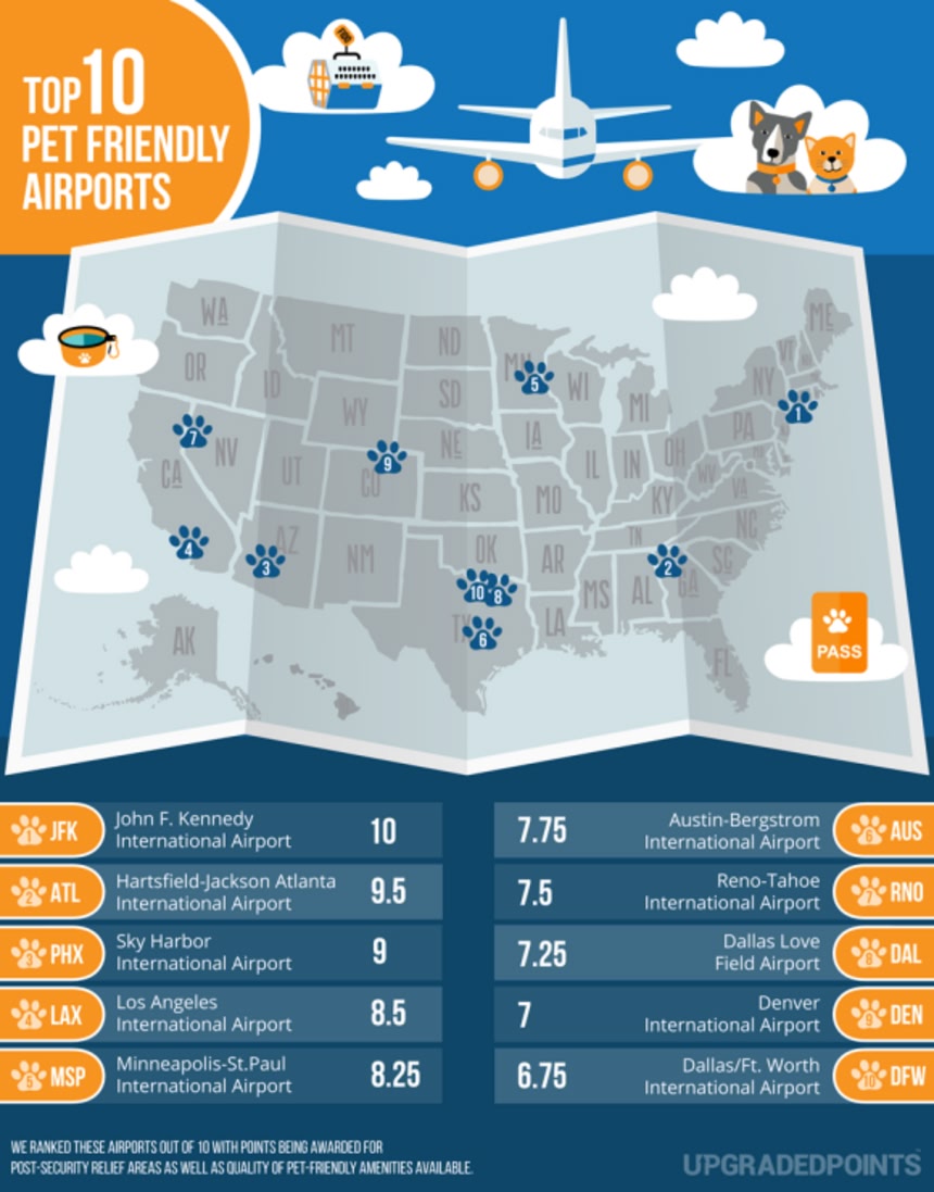 クレカを使ったお得な旅行情報サイトUpgraded Pointsによると、米国内で最もペットにやさしい空港は次のとおり。数字は10ptを満点とした評価点だ。
