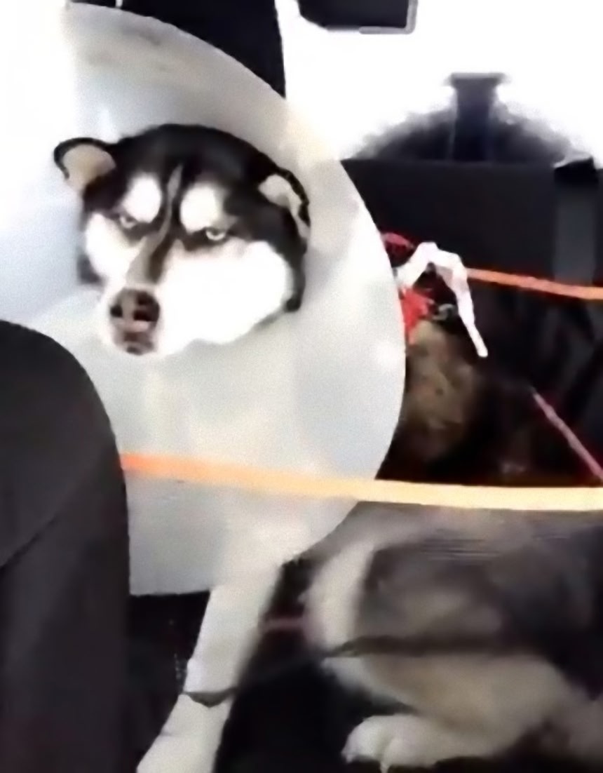 この画像を大きなサイズで見るハスキーは怒ってなくてもオコに見える場合もある。もしかしたら本当は怒っていないのかもしれない。でも首についた巨大なエリザベスカラーには違和感があったのかもしれない。