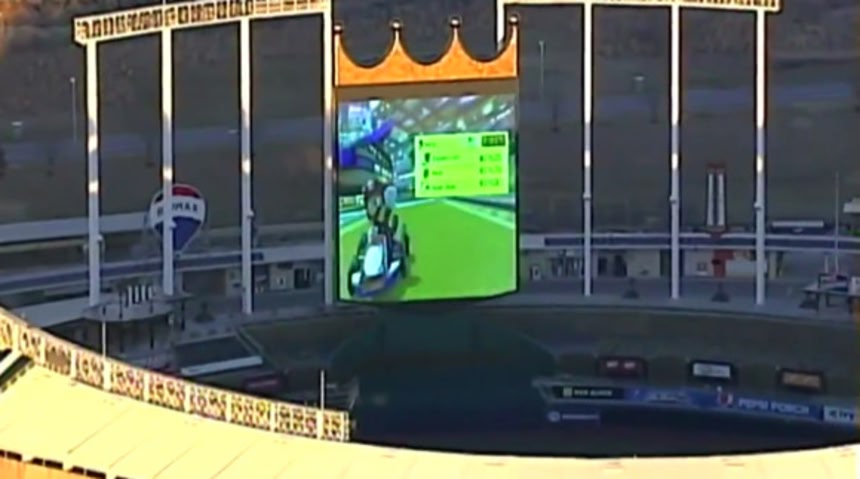 ミズーリ州カンザスシティにあるカウフマン・スタジアムのスクリーンでプレイされてるマリオカート。