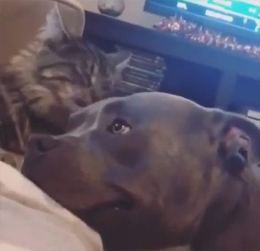 猫に頭をペロペロとグルーミングされて、うっとりが止まらない犬。