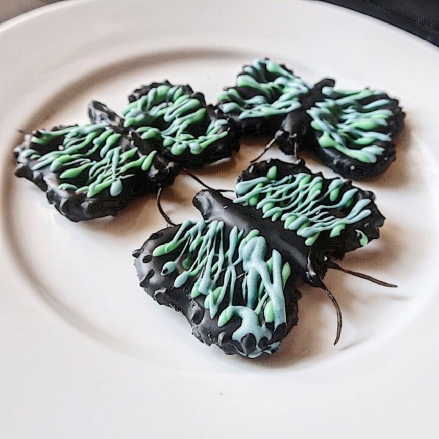 この画像を大きなサイズで見るブラックチョコのアゲハ蝶のボディは体のカットしたトッポにプレッツェルの羽をつけたもの。
