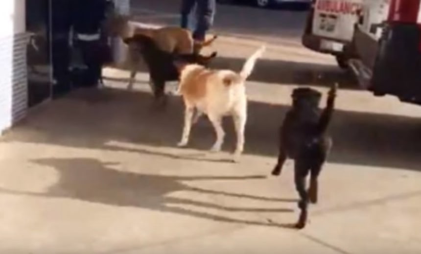 飼い主が乗る救急車を追ってきた犬たち
