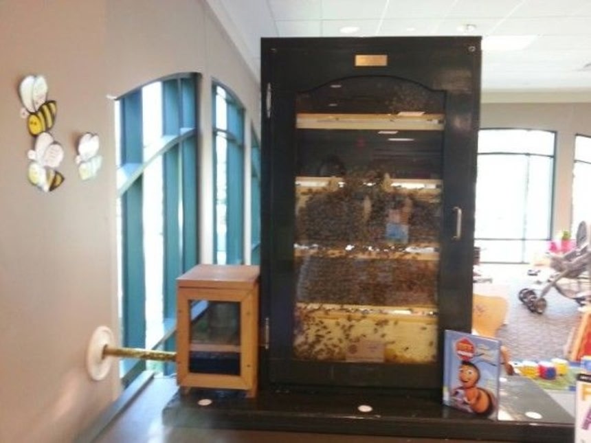 この画像を大きなサイズで見る児童書コーナーに置かれた本棚を利用した蜂の巣箱は、外側に通じるチューブがあって蜂が出入りできるようになっている。蜂の観察にはもってこい。