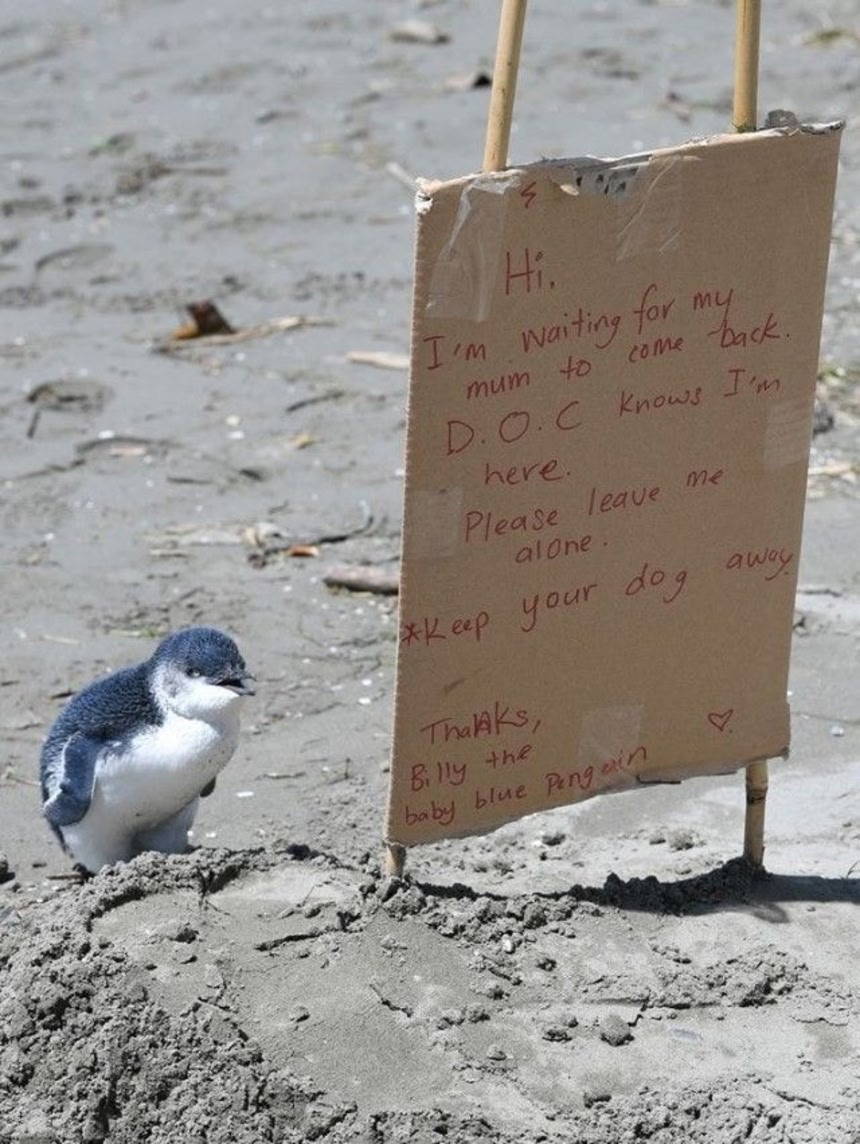 こんにちは。僕はビリーです。ママを待っています。獣医さんも僕がここにいることを知っています。なのでご心配なく放っておいてください。あとどうか犬たちを僕から遠ざけてください。読んでくれてありがとう 赤ちゃんブルーペンギンのビリーより。