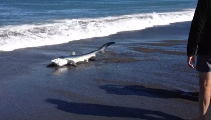 この画像を大きなサイズで見るヨシキリザメは成長すると、全長が2~3mに達するという。もしかするとこの映像のサメは、まだ子供だったのかもしれないね。無事に海に戻れてよかったね。