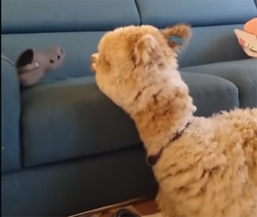 南オーストラリア、アデレードの、あるご家庭で飼育されているアルパカのアルフィ。飼い主が脱ぎ捨てたクロックスのサンダルが気になって仕方がないようで、いじりいじりしているのである。