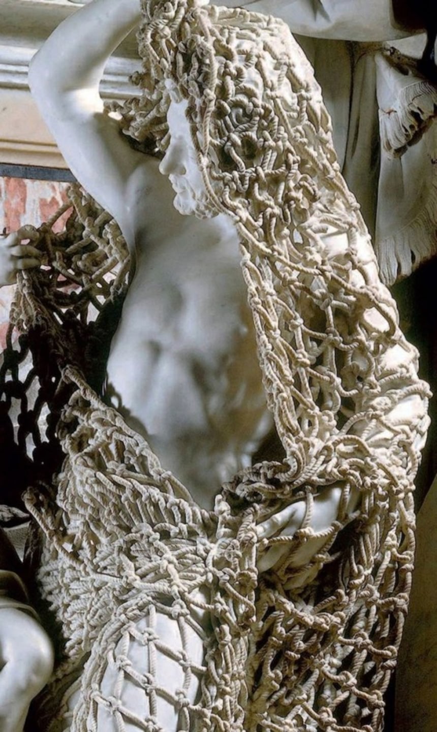 パッと見では像に網をかけた珍しい作品?と思いきや、なんとすべてが彫刻!柔らかそうな網までもが大理石でできているのだ。
