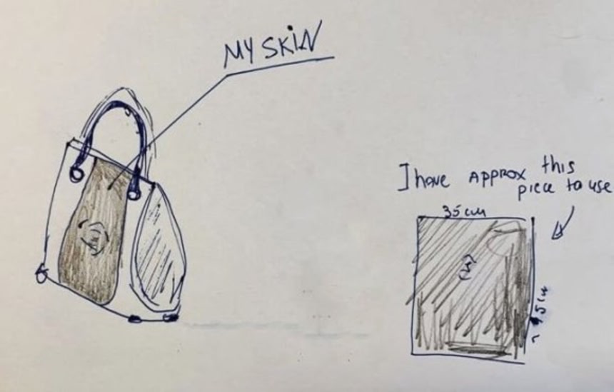 ご本人の希望デザイン画からみるとバッグ全体でなくワンポイントとして皮膚を使って欲しいみたいだからサイズは多少小さくなるにしても可能な気はする