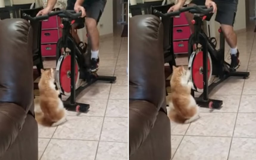 飼い主が部屋に設置したエクササイズバイク(スピンバイク)でトレーニング。それを見た猫はそのバイクで一緒にエクササイズを開始したようだ。