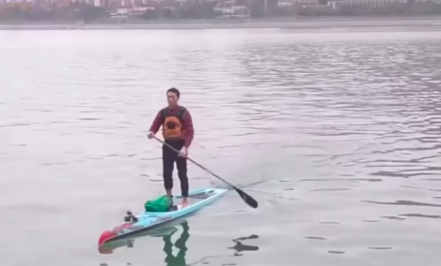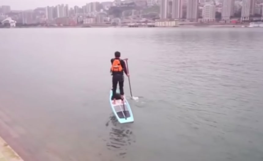 揚子江をSUP(スタンドアップパドルボード)で横切ることで、本来であれば1時間以上かかる通勤時間をなんと6分ほどに短縮したのである。