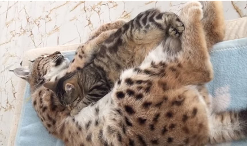 まったく同じ種類の猫でも相性はあるのだが、このオオヤマネコとイエネコは相性が良かったようだ。大きなオオヤマネコに寄り添いながらイエネコがスヤスヤと一緒に眠っているよ。