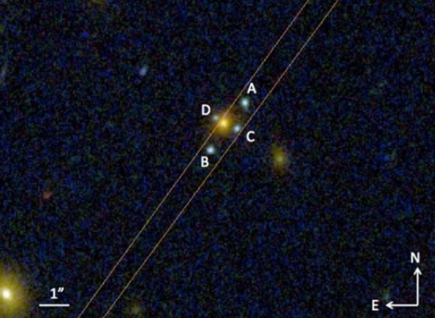 珍しいことに、今回のケースでは、虫眼鏡のように作用する銀河によって光が曲げられることで、光がまるで十字架のように4つの点になって並んでいる――「アインシュタインの十字架」と呼ばれる現象だ。
