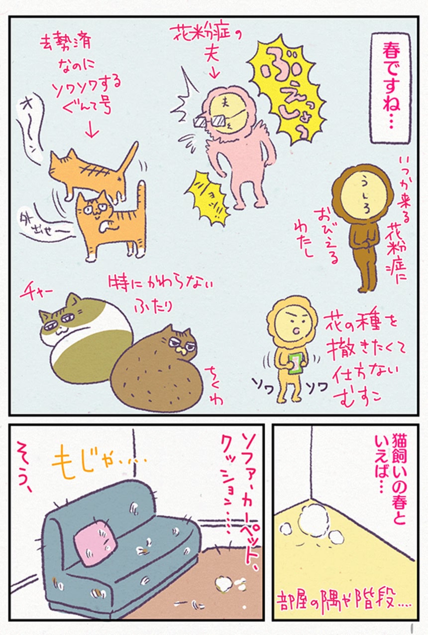 日が長くなり、ポカポカ日和は猫も人もウキウキの春だけれど、猫を3匹買っているいぶり家では春の悩ましい事態が進行中だ。