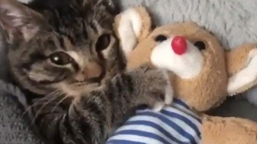 小さなお布団の中で眠る準備万端の小猫。前足を空中で踏み踏みして今にも眠りそうなんだけど、うとうとする目を何とか頑張って開けて誰かを待っているようだ。どうやらいつも寝る時は一緒のぬいぐるみを待っていたらしい。ぬいぐるみが来るとしがみついて、安心したようにお休みモードに入っていくよ。