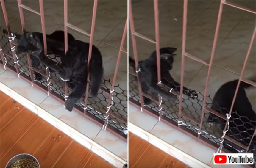 犬が柵の向こうに行きたがってる合図を察知した猫が駆け寄ってきて、脱走の手引きをする。
