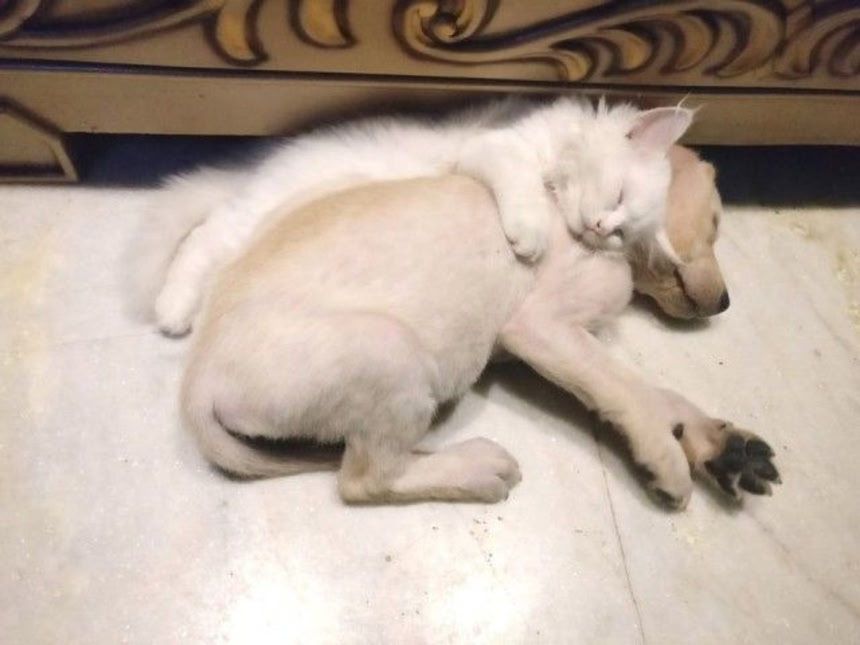 この画像を大きなサイズで見る2. 友人が引き取ってきた子猫がすっかり気に入ってしまった先住の愛犬。いつもこうやっていっしょに眠ってるの