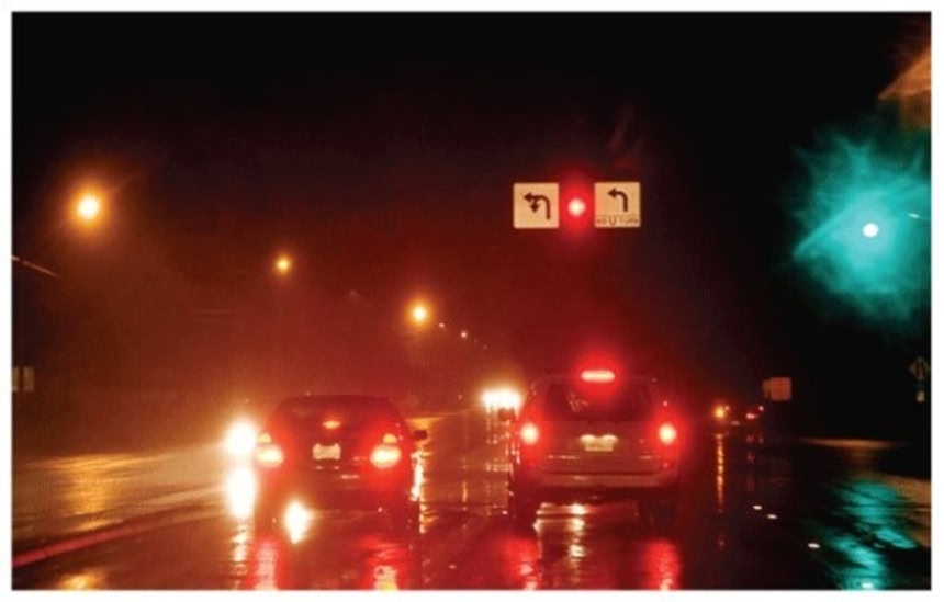 画像に写るのは夜間の道路上、赤信号で停止している自動車である。乱視ではない人々の目には、自動車のバックライトや信号機が赤く光って見える。