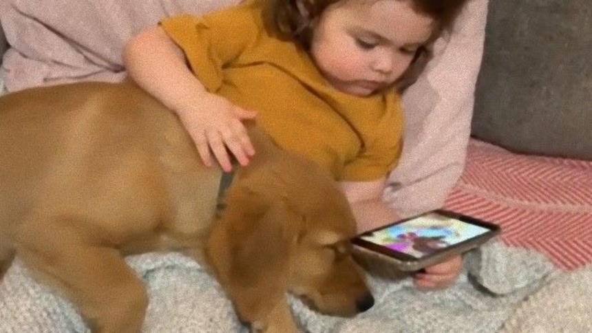 小さき存在だった赤ちゃんが子犬とともに育つ姿もいいけれど、子犬が少年少女に守られてすくすく育つ様子もこれまたいい。少女が子犬を膝に抱いて、撫でてあげているある夜のことが撮影されていた。