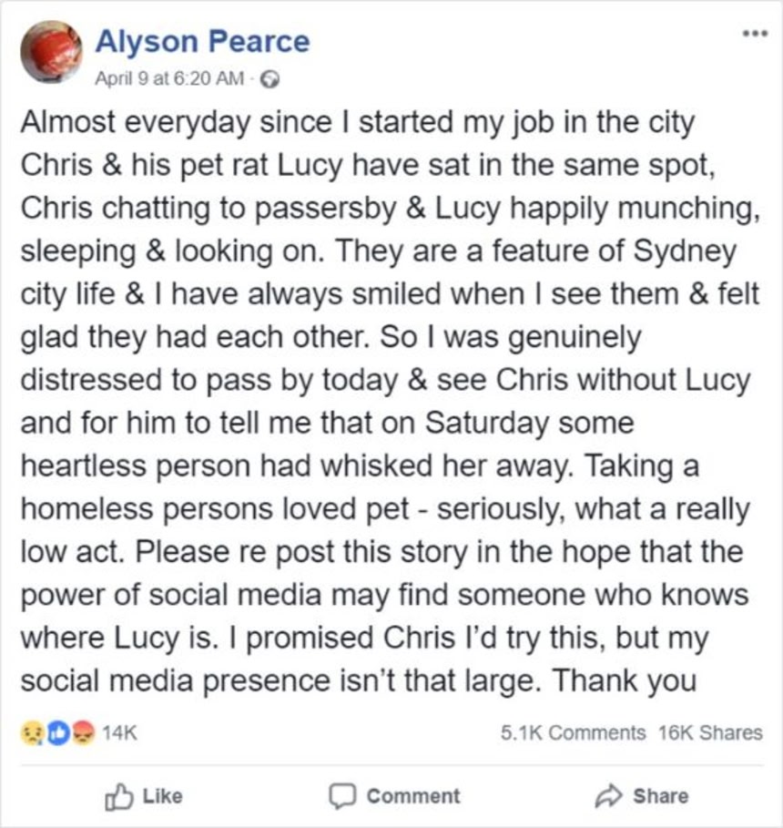 この画像を大きなサイズで見るオーストラリア、シドニーにお住いのアリソン・ピアースさんは毎日職場に行く途中の同じ場所で、クリスさんというホームレスのおじいさんとそのペットであるネズミのルーシーを見かけていた。