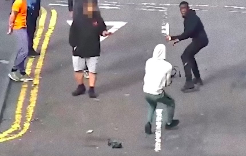 この画像を大きなサイズで見るイギリス北東部のニューカッスル・アポン・タインの繁華街で、二人の男性が山刀(マチェテ)で決闘しているかのような、アクション映画さながらの光景がとらえられた。