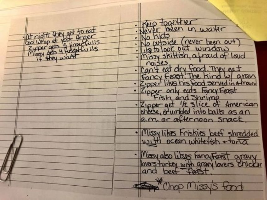 おばあさんは施設に入る前、ジッパーとミッシーのために書き記したメモを残した。そこには2匹の特徴や好き嫌いなどが丁寧に書き込まれている。