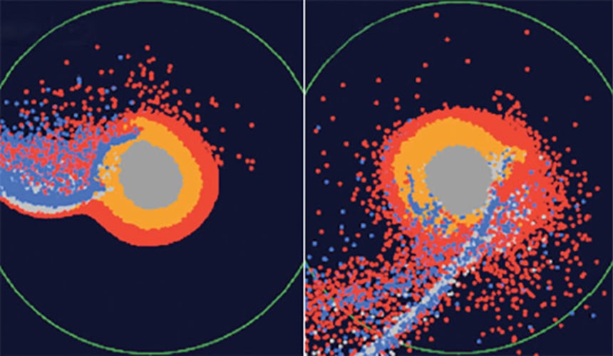 この画像を大きなサイズで見るインパクター(青)とマグマに覆われた原始の地球(赤)との衝突を再現したシミュレーション。膨大な量の溶岩が宇宙に飛び散り、周囲に円盤を形成。これがやがて融合して月となった。