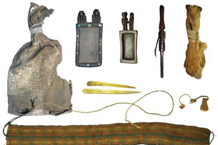 人間の埋葬品の一部であると思われる、この儀式用の包みからは、人物が掘られた木製のタブレット(植物を粉状に粉砕するためのもの)、幻覚を生み出す植物を燃やし、その煙を吸い込むための吸引用管(人間の三つ編みの髪がついている)、3匹のキツネの口吻を縫い合わせて作ったポーチ、ラマの骨のヘラなどが出てきた。