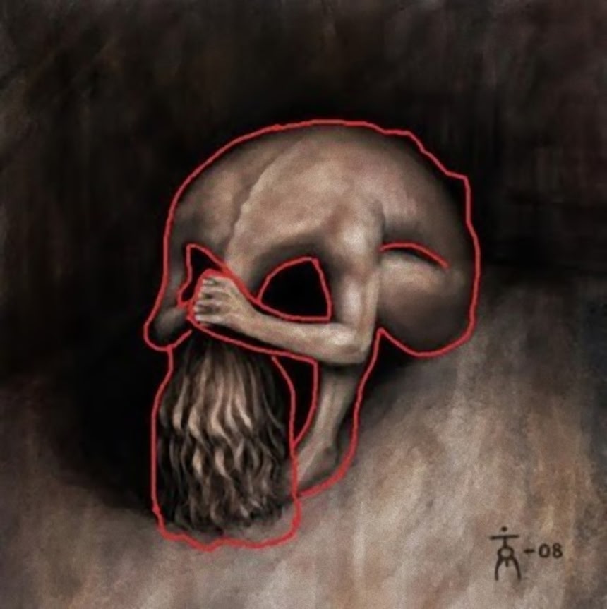 すいません見た瞬間に「骸骨か頭抱えた人のどちらにも見える絵」にしか見えませんでした