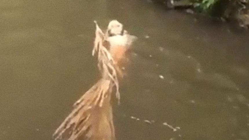 スイスイ泳ぐプルートの口には…ボールじゃなくて何やら大物の枝が