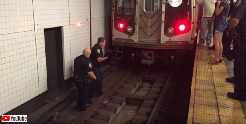 マンハッタンの地下鉄のホームで、飼い主と電車を待っていた猫が騒音に驚いて、電車が走る線路に逃走。向かってきた車両が停止してもなお、パニックで動けなくなってしまった。