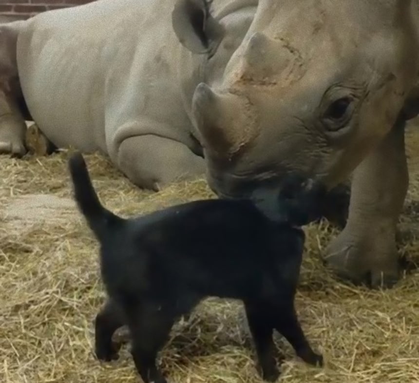 当時、サイの飼育にかけては1番という飼育員ジャンさんの発案で、1匹の黒猫が厩舎へと連れて来られた。その目的は、厩舎に現れるネズミやリス、ウサギなどを追い出すためと、猫がサイの遊び相手になればという思いからだった。