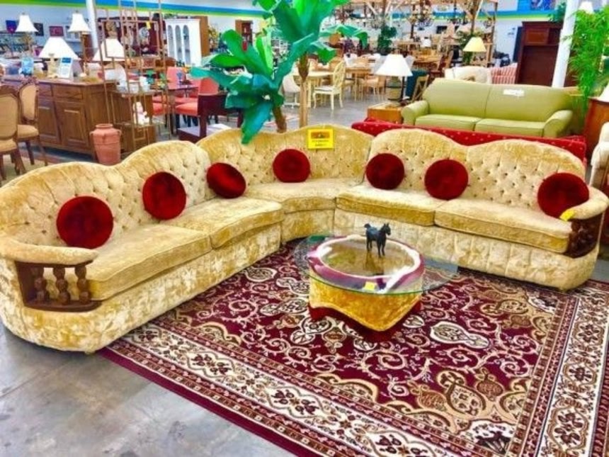 この画像を大きなサイズで見るソファは生地で、クッションはサラミかトマトに見える。真ん中のテーブルはピザがピザケースにくっつかないように使うピザセーバーにも見える。