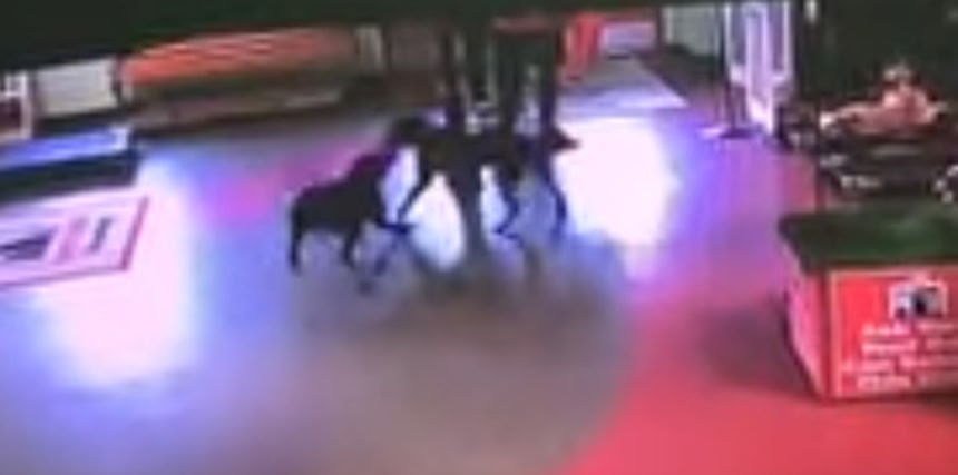 全速力で駐車場に入り、スタッフの1人に続いて正面から入ってきたヒューゴ。ホテルの防犯カメラが弾丸のような姿をとらえている。