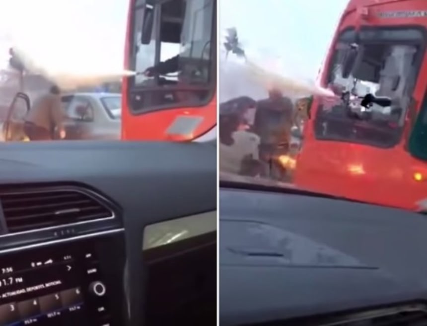 バスの運転手はクラクションを鳴らして威嚇するが、こりゃあダメだと思ったのかどうなのか消火器を手にして相手の顔に消火薬剤を噴射!