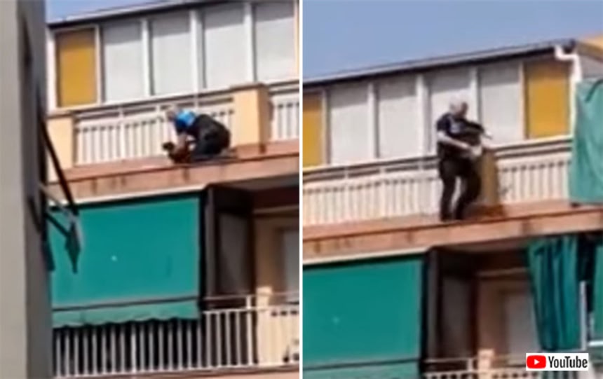 スペイン、カタルーニャ州バルセロナ県の自治体、サンタ・クローマ・ダ・グラマネートで、犬が集合住宅の5階のベランダの手すりの外に出てしまった。