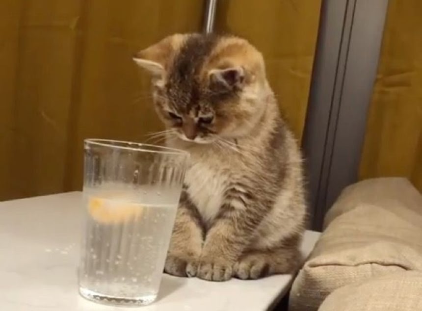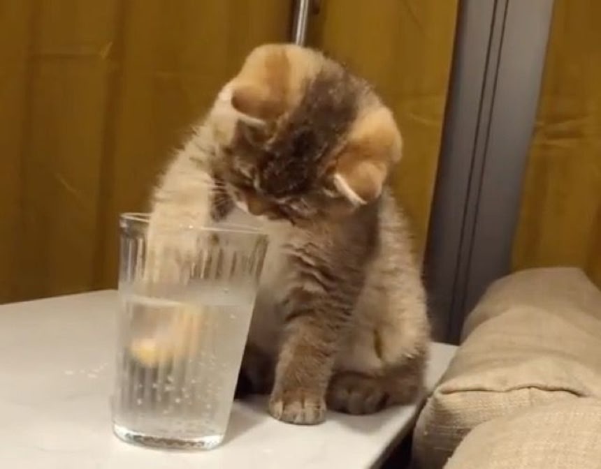 というわけで、ブリティッシュショートヘアーの子猫・チアさんが釘づけになっているのは、目の前のコップ。
