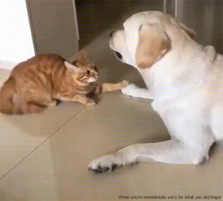 3度目行くかと思いきや、これ以上はヤバそうだと判断したのか、猫は自分の前脚を犬の前脚に差し出し、人間界でいうところの握手のポーズ。