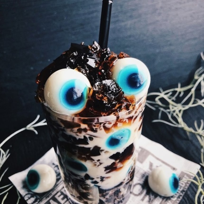 この画像を大きなサイズで見る作り方は、基本のドロリッチ風ゼリードリンクに、粉寒天、砂糖、牛乳で作った目玉に粉寒天、砂糖、水で作った虹彩と瞳孔を貼った目玉をインするだけ。