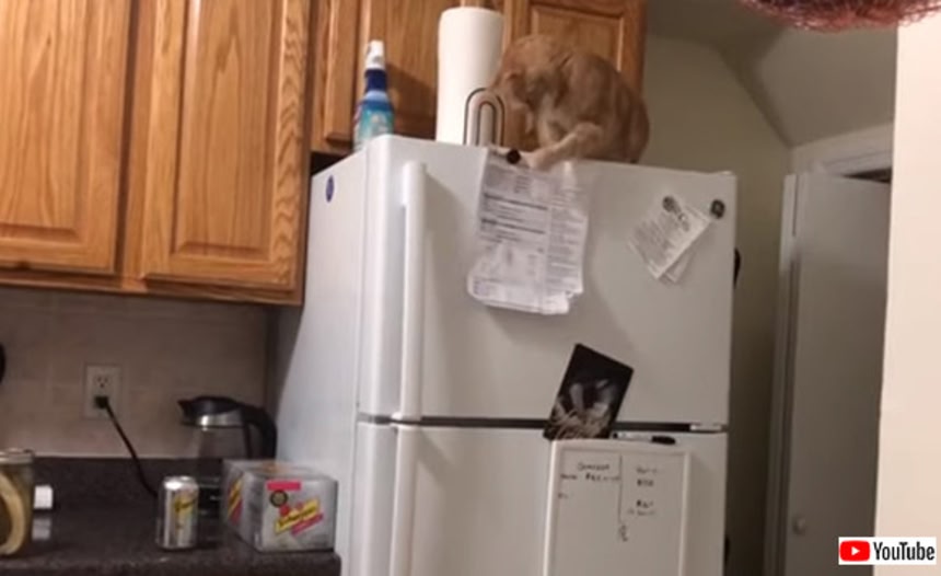 冷蔵庫のトップをとったものの、自分の制覇した冷蔵庫に紙が貼ってあるのが気に入らなかったのか、まずは1枚目を落としにいく。