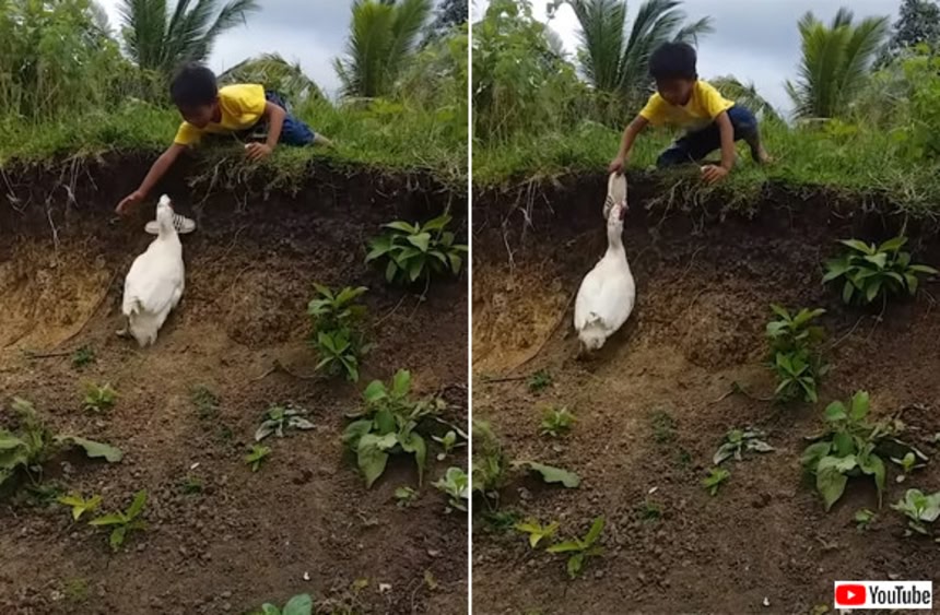 たぶん、この動画のアヒルはこの少年の家のペットで、「とってこい」の訓練を受けてると思う。