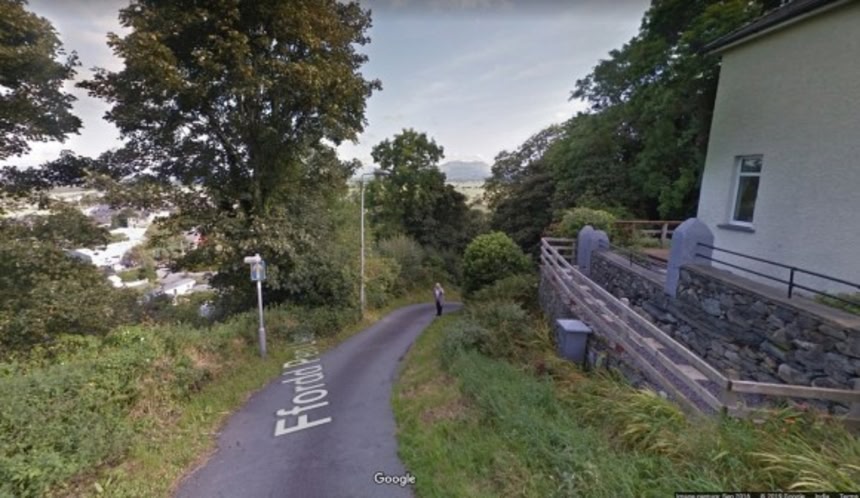 グーグル・ストリートビューでフォルズ・ペン・スレフ全体を見てみると、狭く曲がりくねっていて両側には深い草木が茂り山道感が強い。ストリート(通り)という雰囲気ではないのだ。