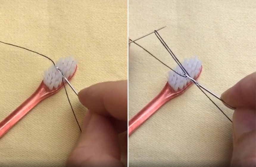 動画の歯ブラシを指に置き換えるだけで、針と糸の置き方は同じ。