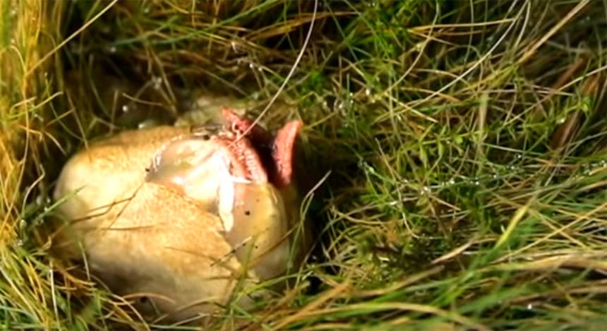別の写真では、内部にあるその赤い触手のようなものが膜から出ようとすると、外側の革のように堅そうな外皮が押し上げられている様子がわかる。