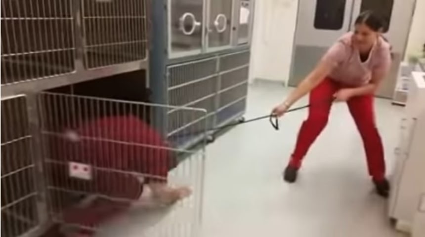 そこで次に、獣医は紐付きの棒を用意。この器具を、ケージの中にいる猫の首にひっかけて、外へ導き出すというのだ。