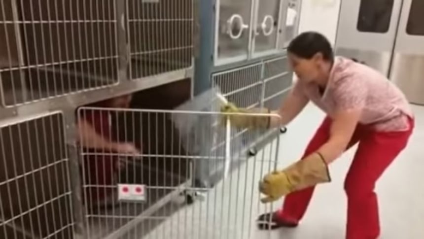 このパネルは、攻撃をしかけて外に逃げようとする猫を優しくケージの中に押し戻すのに役立つという。まるで警察機動隊のようにそれを前に掲げながらジリジリとケージへ近付く獣医。