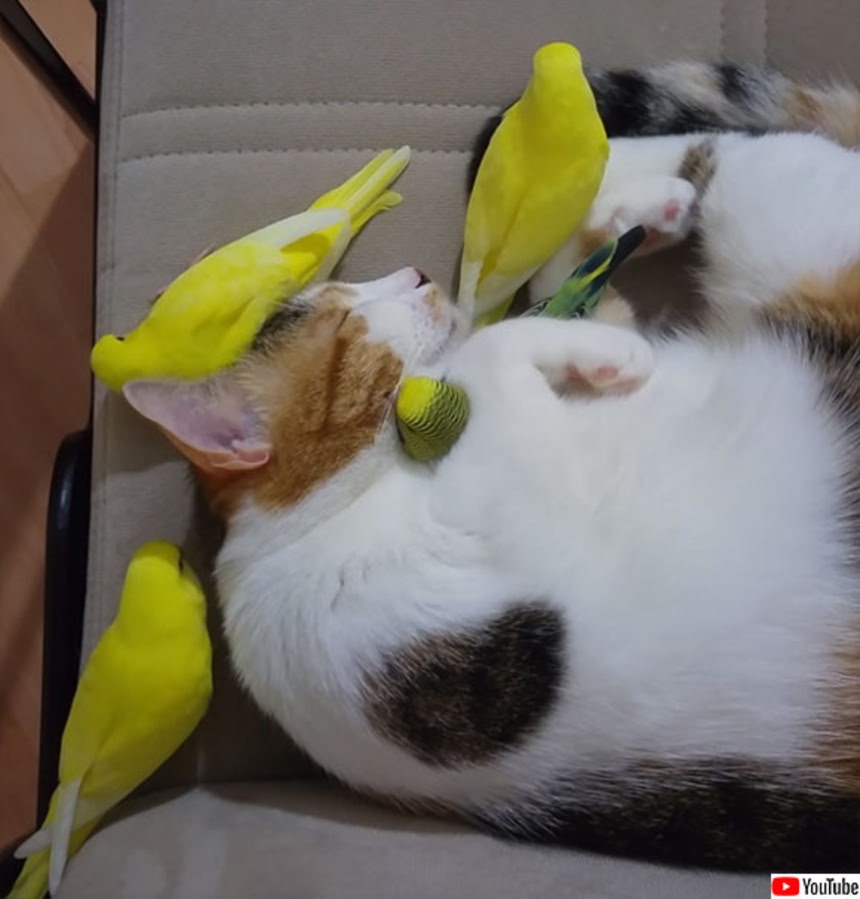 Cat and Parakeets Nap Together || ViralHog(v=5yfO3LYb2BE)