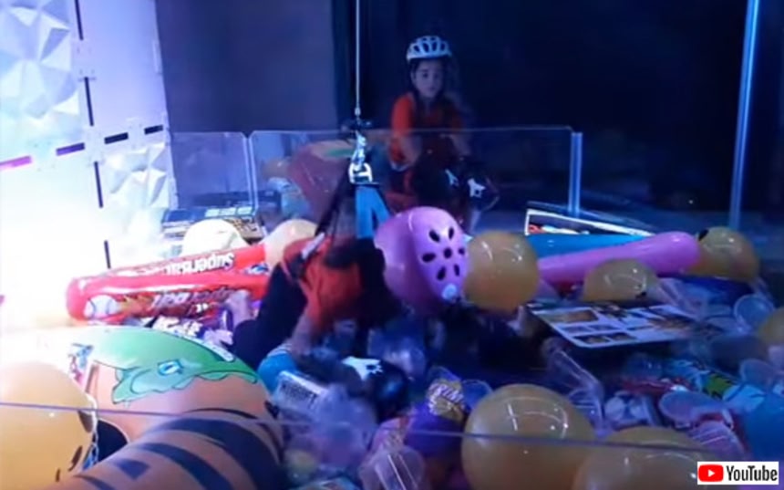 なんとクララちゃん本人を吊り上げて景品をわしづかみにさせる、という大がかりなクレーンゲーム。そのアイデアを実現しちゃった動画がこれだ。