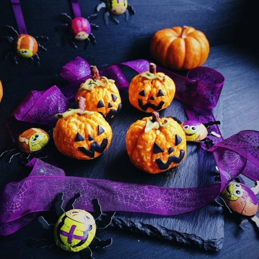 ライスクリスピーをパンプキンの形にした楽しいお菓子だ。電子レンジだけで簡単に作れて見た目もかわいい。お米でできたポン菓子にマシュマロを加えて造形したもので、様々な表情のパンプキンがアレンジできるよ。