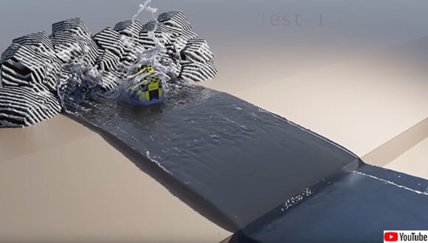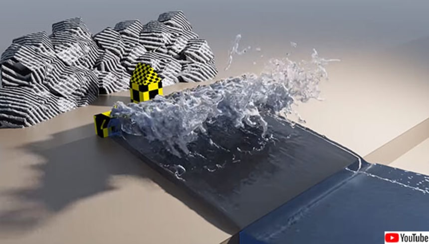 海岸堤防に必要なのは高さだけでなくその形状にもあるようだ。流体シミュレーションツール「FLIP Fluids」を使い、海岸堤防の形状の違いで波から受ける影響を物理的にシミュレーションした動画がYoutubeに公開されていた。